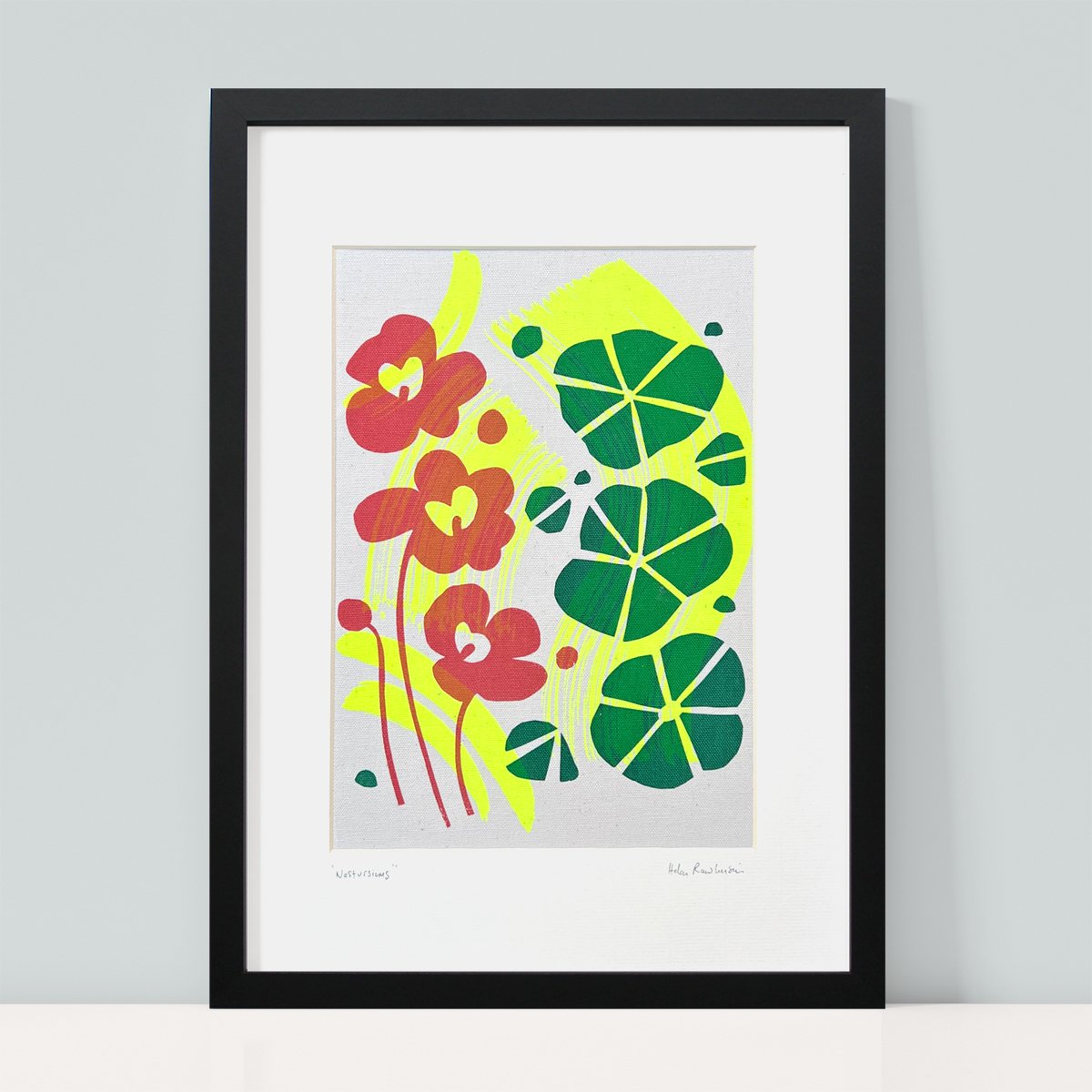 A cheerful trio of nasturtiums with a neon yellow brushstroke background.