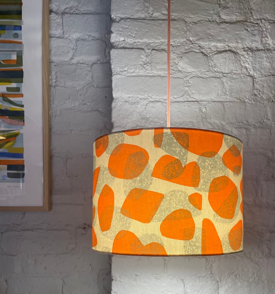 From my limited edition range of fabric lampshades. Layered two colour print on organic recycled cotton drill. Printed by hand using paper stencils, so each one is a tiny bit different from the next.